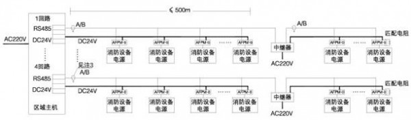2)傳輸距離大于500m時,需加中繼器,1合中繼器占用1個傳感器(監控模塊)地址,中繼器的AC220V電源線采用3*1.5mm^2,由現場消防電源或消防監控室監控器(主機)提供。